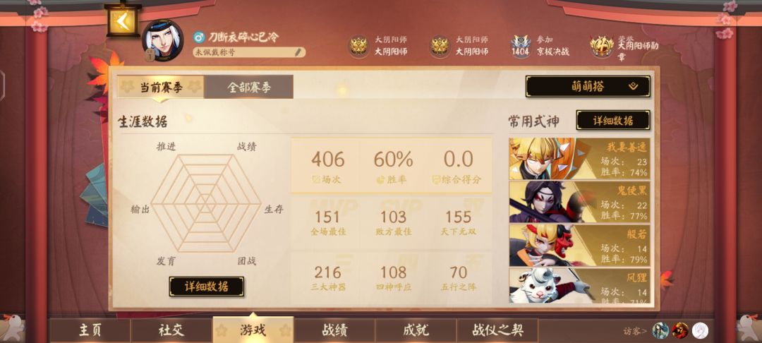 撒由那拉,最好的萌萌搭。从最开始的时候强化祝福悬哥鸦天狗开始爱上这个模式,很少玩娱乐模式的我体验到了有别于资质赛的爽感;在资质赛或者匹配模式,不时面临一两个队友不给力而遗憾败北的情况,而在萌萌搭里只要拿到强力式神或者buff都能带飞,玩一局没被削的强化祝福悬哥鸦天狗爽一天。 本人也是两个赛季玩了700场,现在也来说说个人心目中此模式的式神梯度和buff。 首先,T0给到没被削的强化祝福悬哥,唯一真