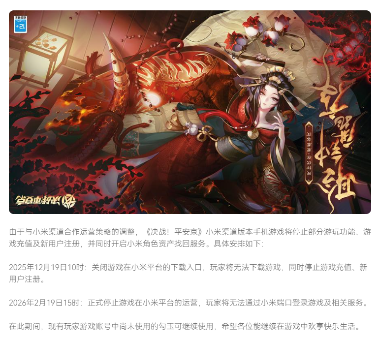 近日,《决战!平安京》小米渠道服突然官宣停运消息,瞬间引爆玩家社群,大量长期使用小米账号游玩的玩家直呼心凉,引发广泛热议。官方公告明确,此次停运源于与小米的合作运营策略调整,核心时间节点已公布:12月19日10时起,小米平台将关闭游戏下载入口,同时暂停充值服务及新用户注册功能;2026年2月19日15时,该渠道服将正式终止运营,届时玩家将无法通过小米端口登录游戏。针对玩家最关心的账号数据保留问