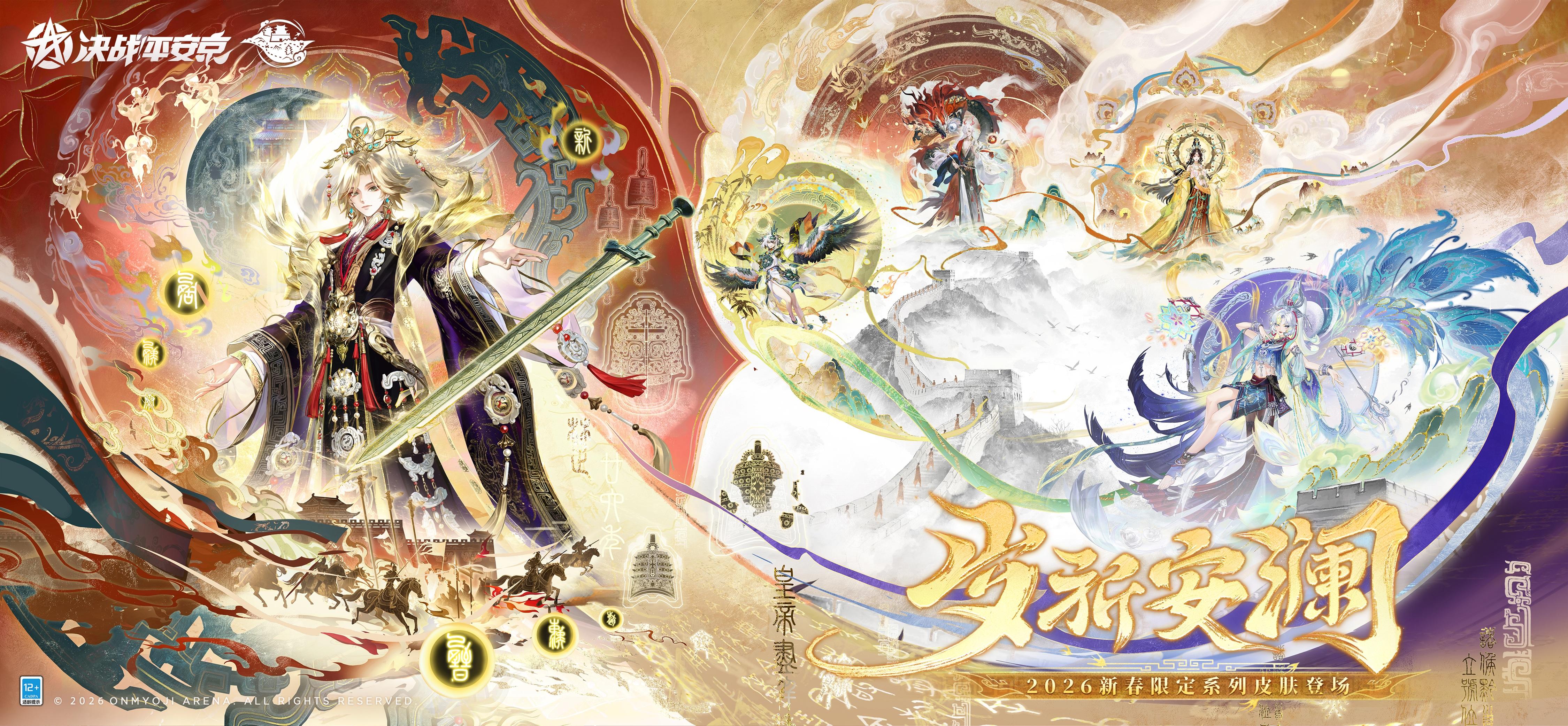 龙脊镇雄关,云岑载曦光, 灵鸟衔新岁,鸣沙覆旧霜。 玉盏酬欢畅,华灯满长安, 山河承永祚,九域共春长。 除夕将至,全新岁祈安澜系列限定皮肤即将登场—— 2月16日零点-4月12日,帝释天传说限定皮肤「雍昭长安」、凤凰火限定皮肤「玉门鸣霄」、一目连限定皮肤「山海司宁」、以津真天限定皮肤「蜀岭行歌」、孔雀明王限定皮肤「云山颂瑞」将同步上线,大人们可别错过啦~ #平安京岁祈安澜 #来平安京开团圆局 #