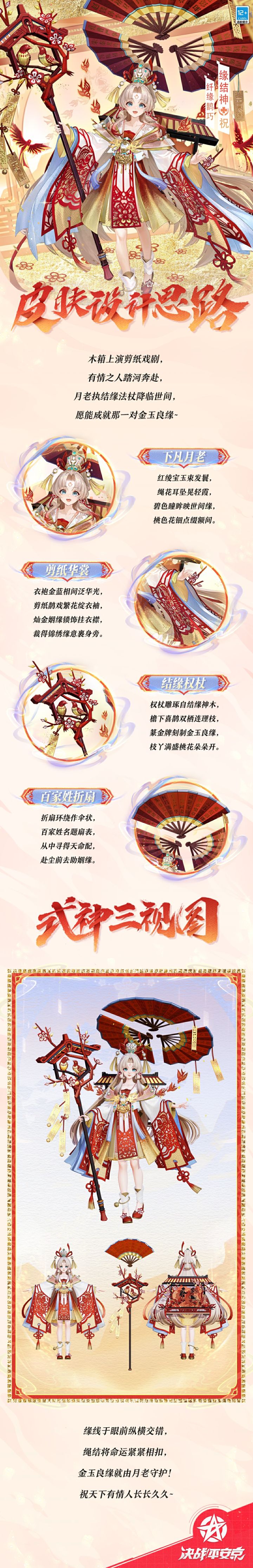 #决战平安京 #平安京浮生万象 适逢良辰佳节,有情人执手相伴, 红线缠绕连结,命运缘分紧相依, 牛郎织女剪纸戏,木箱预知姻缘吉。 杖上桃花烂漫开,见证情满尘世间。 11月21日维护后-1月15日,缘结神全新浮生万象系列限定皮肤「纤缘鹊巧」将限时上架服装铺,售价96皮肤券,首周享限时8.8折优惠! ▷特效设计思路 月老缘结神降临人世,只为亲眼看看凡人的情缘是如何悄然生长的。她背着的木箱中上演着