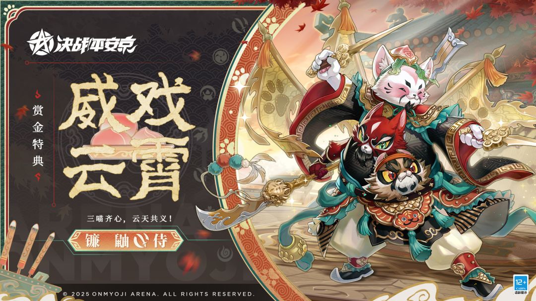 #决战平安京 #新皮肤情报 大刀斩落,长矛挥动, 双剑同舞,共退来敌。 此曲终了,震撼人心, 英灵之象,永世传唱。 3月28日维护后,镰鼬全新赏金特典皮肤「威戏云霄」正式登场! 获取方式: 1.购买S29赛季赏金特典 2.将赏金特典等级提升至80级 *展示视频为测试版本,以实际上线效果为准 #决战平安京S29赛季