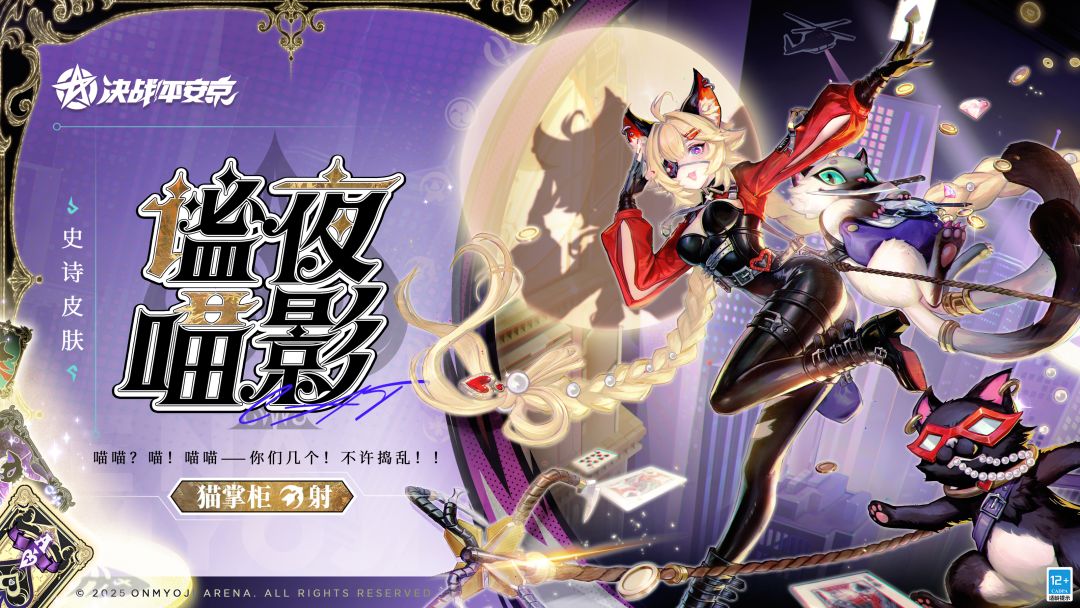 #决战平安京 #新皮肤情报 星幕低垂,猫咪的身影在黑暗中穿梭, 精心筹划,每一步的行动都分工明确。 少女动作轻盈,搭乘滑索落地无声, 成功盗取宝物,如影子般遁入夜色。 3月28日维护后,猫掌柜全新异都奇想系列皮肤「谧夜喵影」即将上架服装铺,售价96皮肤券,首周享限时8.8折优惠!同时,专属定制按键[定制按键·谧夜喵影]将同步上架[商城]-[杂货铺],售价148勾玉,请勿错过哦~ ▷特效设计思