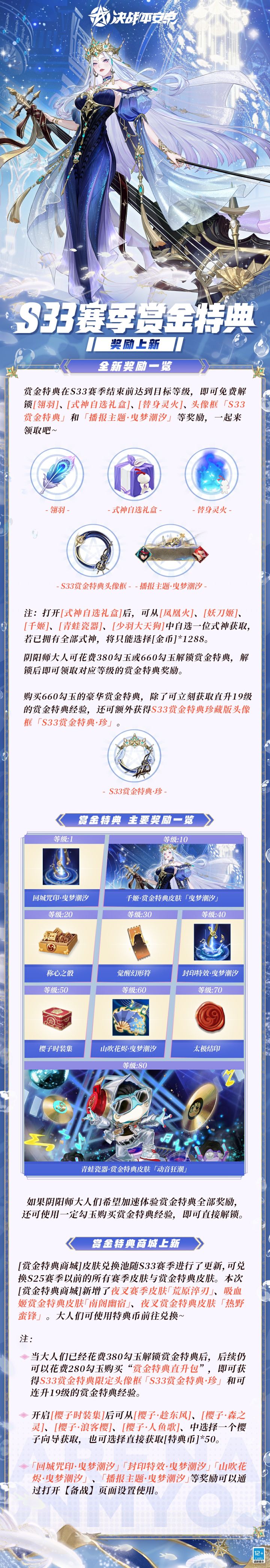 永夜的极光凝作璀璨晶灯,波澜潮汐奏响曳梦序曲。 女王踏浪而来,鲛磷熠熠若星河碎落,曲律与涟漪相拥,共坠一场深海幻梦…… 3月27日维护后,千姬全新赏金特典皮肤「曳梦潮汐」正式登场!大人们购买S33赛季赏金特典,且等级提升至10级即可领取该皮肤! *展示视频为测试版本,以实际上线效果为准 #决战平安京 #决战平安京S33赛季 #千姬 #moba