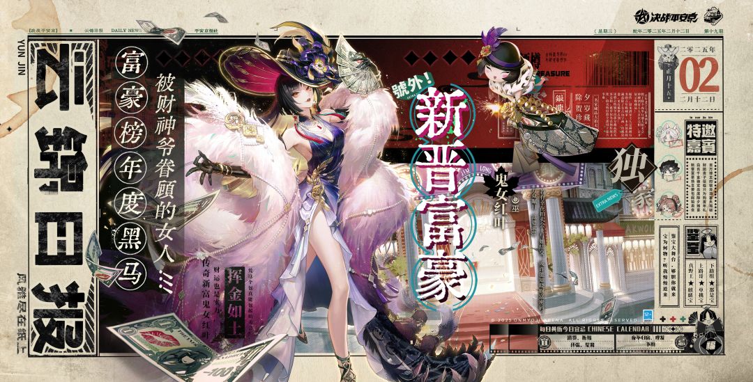 折扇轻摇,钞票纷来, 瑰丽奇珍,统统拿下! 高调竞价间,锁定千古宝剑, 霓虹鎏光下,揭开风云华章。 2月12日-4月8日,鬼女红叶全新琼阁风云系列传说限定皮肤「醉金霓」将限时上架服装铺,售价168皮肤券,前两周享限时8.8折优惠! ▷特效设计思路 鬼女红叶出身于寻宝世家,后被白狼邀请加入风云事务所,本次与风云事务所的各位搭档共同寻回丢失的千古宝剑。在银龙酒家的拍卖会上,鬼女红叶肆意叫价,成为了全场