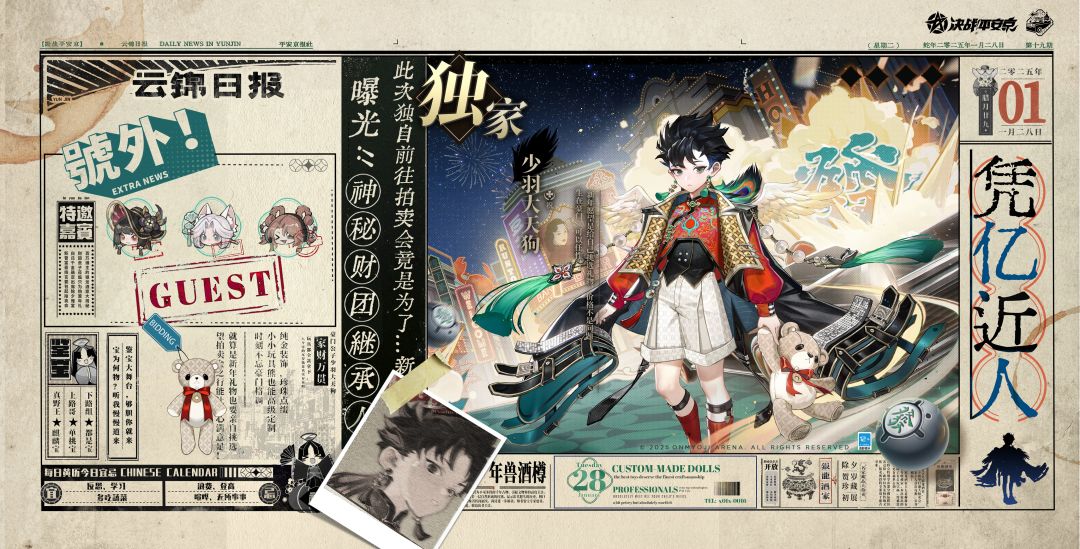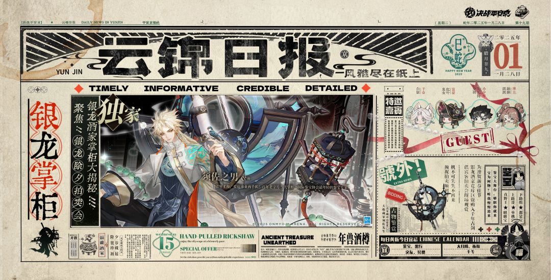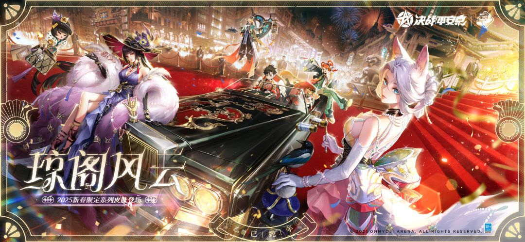 夜宴开场,名流贵客笑晏晏, 古剑亮相,银龙掌柜邀共赏。 殊不知,暗流涌动,伪装悄然褪去, 且看那,风云将起,好戏即刻上演。 除夕将至,全新[琼阁风云]系列限定皮肤——须佐之男「佑琅华」、跳跳妹妹「解玄玑」、少羽大天狗「鎏羽行」、白狼「馥玉引」、鬼女红叶「醉金霓」即将陆续登场,大人们敬请期待! #决战平安京 #平安京新春拍卖会 #平安京琼阁风云