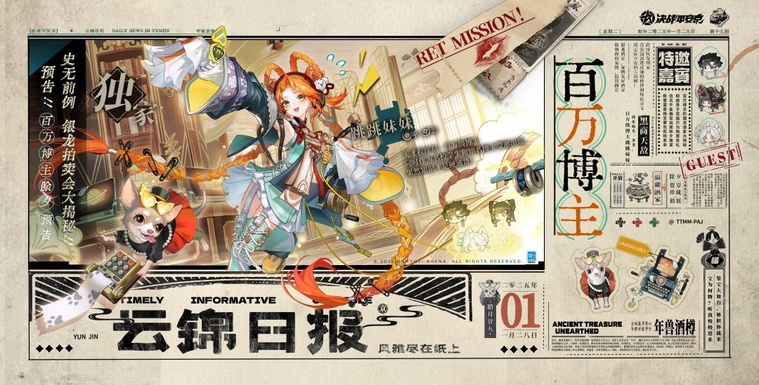 一对过腰双辫聪慧伶俐, 两袖铜币华纹复古灵秀, 几番匿访明了风云暗涌, 四座惊而鹊起波诡丛生。 1月28日0点整-3月24日,跳跳妹妹全新琼阁风云系列限定皮肤「解玄玑」将限时上架服装铺,售价106皮肤券,前两周享限时8.8折优惠! ▷特效设计思路 表面是百万级别曝光的萌系博主,实则是天才黑客少女的跳跳妹妹,时常借以探店博主的身份游走于灰色地带。此次慈善拍卖会将启,她再次以百万博主的身份出席琼阁夜宴
