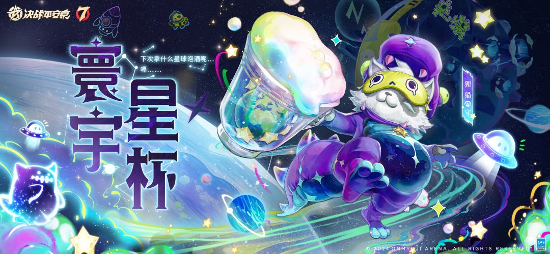 #决战平安京七周年 #狸猫典藏皮肤 抱着珍爱的酒杯游遍寰宇, 品尝填满心灵的美酒佳酿, 庞大身躯却遭人类误解与驱赶, 无奈品酒大师也会被当成怪物呢~ 2024年12月27日维护后-2025年4月24日,狸猫全新典藏皮肤「寰宇星杯」将开启限时兑换,售价688达摩币。 ▷特效设计思路 爱喝酒的宇宙怪兽,在沉睡多年后逐渐苏醒。他像星际旅人一般带着慵懒与好奇,乘坐飞船降临地球,抱着酒杯想要去寻觅触动