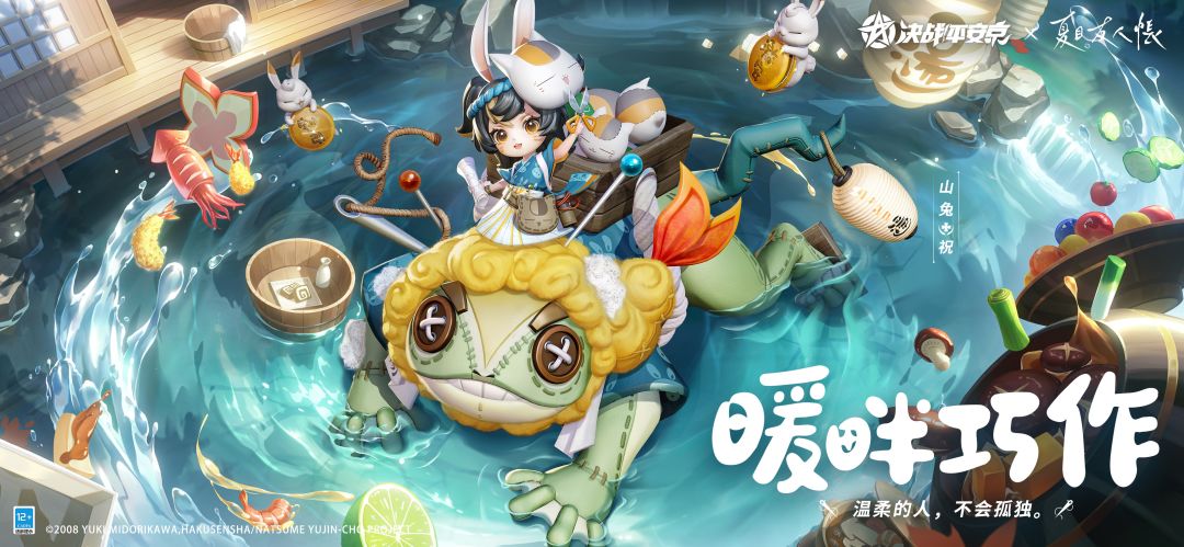 #决战平安京夏目友人帐联动 手工纪念品店悬挂着促销招牌, 三色丸子和炸虾的香味,让猫咪老师驻足。 娇小的店主挥舞着手中的针线, 无论是制作玩偶或料理,都需要用心对待! 《决战!平安京》×TV动画「夏目友人帐」联动即将开启!12月31日0点后-1月13日,山兔联动限定皮肤「暖畔巧作」将限时上架服装铺,售价86皮肤券,首周享限时8.8折优惠! ▷特效设计思路 山兔在温泉旅馆里开了一家贩卖手工玩偶