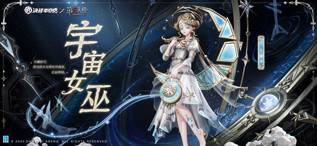 #决战平安京第五人格联动 跨越星辰,置身寰宇。 优雅的宇宙巫女,掌握着时空之力。 纵使烈焰燃身,也未能留下烧灼的痕迹,当月满星空之时,她早已自由无拘。 《决战!平安京》×《第五人格》联动即将开启!10月25日维护后-11月21日,雪女联动限定皮肤「宇宙女巫」将限时上架服装铺,售价96皮肤券,首周享限时8.8折优惠! ▷特效设计思路 穿越星辰而来的「宇宙女巫」,头戴星环桂冠,身负创造魔法,拥有
