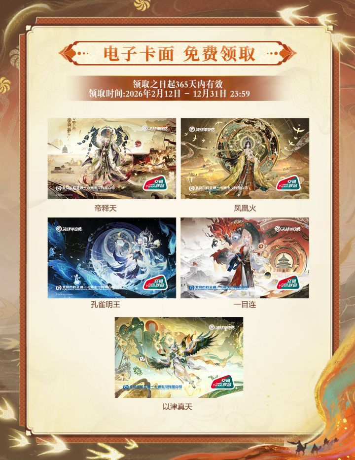 时祺福至,马到功成!2月12日维护后,大人们参与[时祺踏春行]等春节活动,与式神崽崽们结伴,同游美景,领取[勾玉]、[皮肤]、[皮肤券]和[岁祈安澜头像礼盒]等奖励!更多详情快戳视频了解吧~(● ˃̶͈̀ロ˂̶͈́)੭⁾⁾ ⋆⌁⌁⌁时祺踏春行⌁⌁⌁⋆ 活动期间集齐指定数量照片,可领取[皮肤券]*5、[宝叶]*300和[岁祈安澜头像礼盒]奖励! ⋆⌁⌁⌁福骐献瑞⌁⌁⌁⋆ 参与活动消耗[金驭币]即可