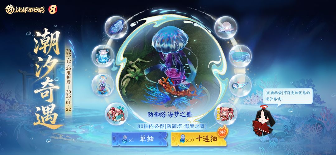 八周年庆典即将启幕,全新周年限定动态防御塔皮肤同步登场! 12月26日维护后-1月29日,大人们消耗勾玉购买[潮汐券礼盒]参与活动,保底80抽内必得限定动态防御塔皮肤[防御塔·海梦之舞]!此外,参与活动抽奖还能获得[晴明井特效·急支糖鲨]、[回城咒印·沧涟盈珠]、[信号饰纹·海之霸主]、[生命·梦珊枝]、[播报主题·凝珠语]、我不道表情牌、摸鱼表情牌等各类个性装扮道具!参与[庆典福袋]活动还可