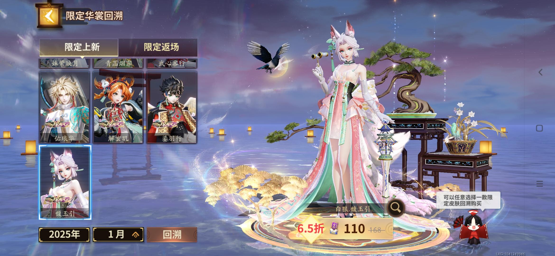 【新式神】1、因幡辉夜姬夜色清冷,竹影婆娑,弦月渐满,辉光洒落,看啊,那遥远月宫正敞开门扉——归期已至,可她竟不舍这人间呐。 特质[愿佑]:受到附近的敌方式神伤害时,自动对周围释放范围伤害并获得护盾。每隔一段时间,获得一次强化普攻,对目标造成范围伤害。 一技能[愿满夜]:在指定区域召唤月之影造成伤害和减速效果,并标记被内圈命中的目标,记录目标当前位置,短暂延迟后将其传送回该位置