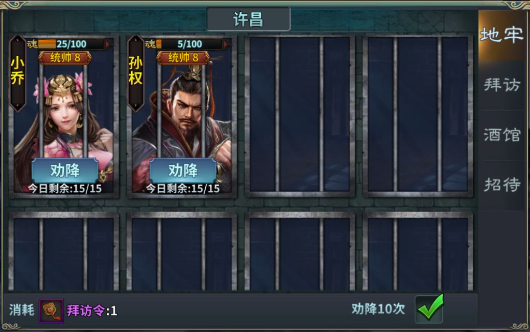 游戏内目前主要分4种统帅的武将:统帅8、统帅10、统帅12、统帅15。其中统帅15需要统帅12的武将入圣后提升的。其它三个统帅的武将可通过游戏内商店,寻宝,招募、定制礼包、武将特卖等多种途径获得。 招募主要分地牢、拜访、酒馆、招待四个玩法。 地牢:通关战役主线副本会解锁统帅8和10的武将,通过拜访令 可以劝降对应的武将。 拜访:获得统帅8和10的武将后,部分武将会显示在拜访系统里面,每日可通弄过消