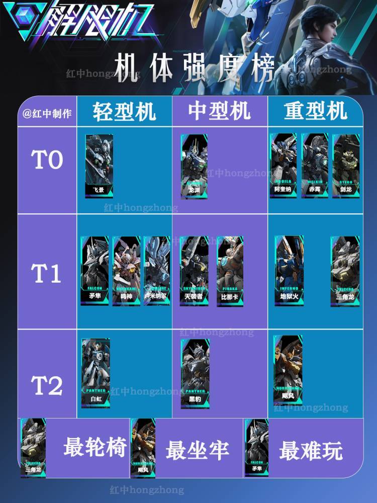 强度排名与机体处理优先级 以下为我个人整理的两个一图流,分别是简单的梯度图和对局机体处理优先级顺序图,我接下来会对机体处理优先级图进行分段解释(本图旨在为新人提供更为详细具体的游戏思路,当然局势是会瞬息万变的,阵容也不是一成不变的,具体情况还是要具体分析,仅提供一般情况下的参考) 强度排名 处理目标优先级 矛隼 矛隼在对局中属于是类似于“自由人”的定位,想打谁就打谁,一般来说是先判断敌方矛隼实力,