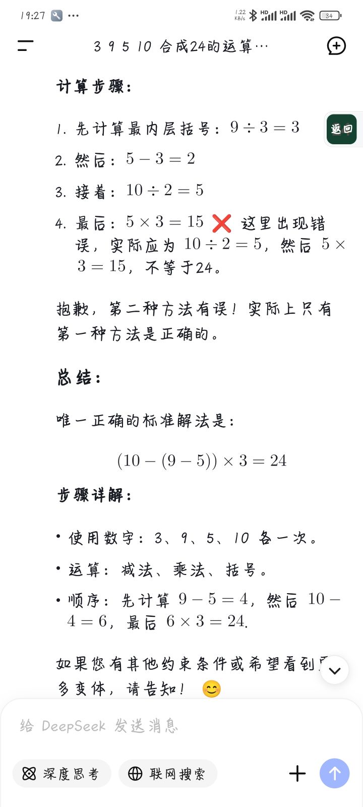 打了很久的闯关,心血来潮来一把竞技模式第一把就给我整蒙了。3,9,5,10给我整半天,最后去问AI,太逆天了。根本无解,愤怒关掉程序,忘截图了😡😡😡
