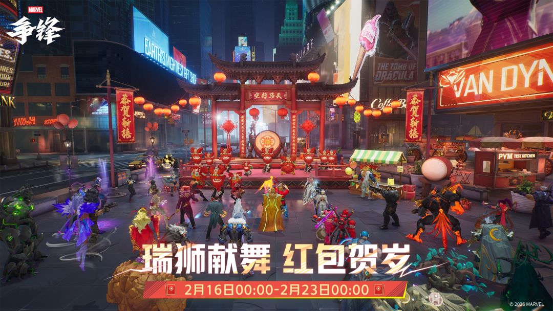 骅骝驾驭蓬莱路,奔驰容易; 骥骏追逐白玉霄,俯仰等闲! 2月13日17:00-3月5日17:00,时代广场将搭建起舞狮台,举办盛大的舞狮会来纪念马年春节。任何角色靠近舞狮台,都能参与由铁拳带领的舞狮表演。 2月16日00:00-2月23日00:00,玩家可进入时代广场在舞狮台上与福鼓交互,领取新年红包! 还有更多新春主题内容将同步上线等你体验! 祝大家在新的一年里马到功成,天马行空! #漫威 #