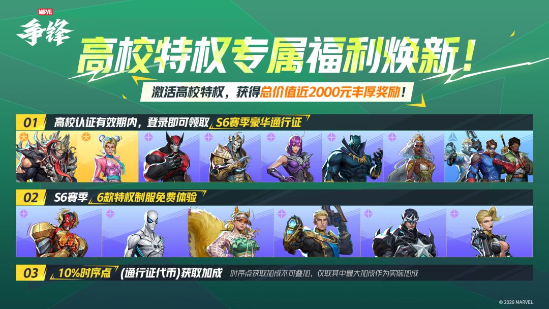 《漫威争锋》第6赛季「博物馆奇妙夜」即将在1月16日正式开启,高校特权也将在版本更新后迎来焕新!各位高校玩家还没激活高校特权?快随着视频的指引激活特权吧! 高校认证有效期内,登录游戏即可直接领取第6赛季豪华通行证「博物馆通票」,10套精美制服及更多外观等你解锁! 凭高校特权还可在游戏内免费体验6款特权制服,并获得10%的时序点获取加成! 激活高校特权,获取海量福利,《漫威争锋》第6赛季「博物馆奇妙
