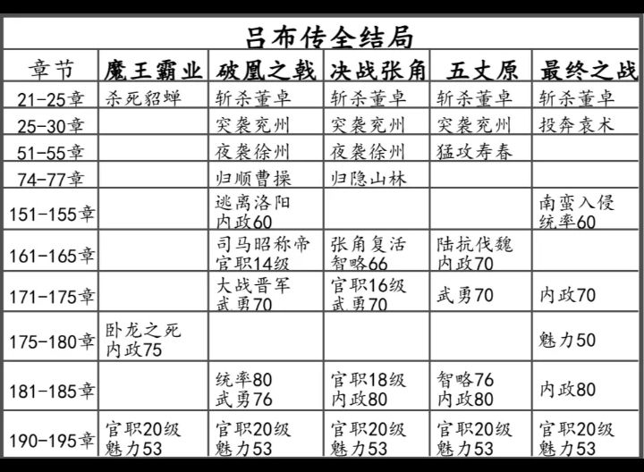 为方便大家观看,现把此前整理的结局分析整合一个帖子。 结局一:魔王霸业(侧重内政) 分支选择:21-25之间出现貂蝉之死和斩杀董卓分支。选择杀貂蝉之死 后期要点在于175-180章的卧龙之死时需要75内政,190-195章时需要20满级官职,最后两个主线需要53魅力。大致上满足这两点即可。 结局二:破凰之戟(侧重武力统御) 分支选择:21-25之间出现貂蝉之死和斩杀董卓分支,选择斩杀董卓; 30章