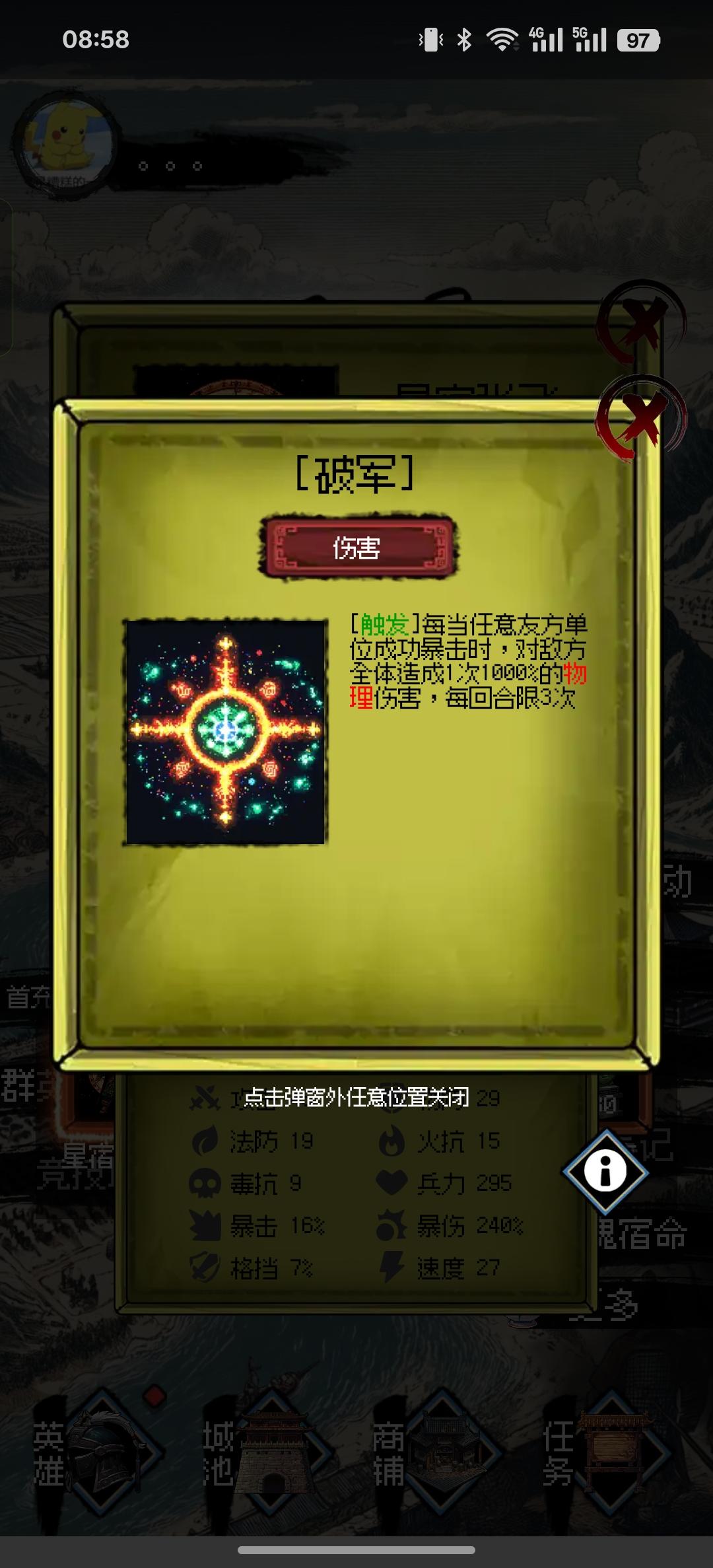 开局随便点,四维属性肯定不够的。我建议直接设置结算退出,然后哪里有红点点哪里,领取完玉石了,城池里先升祭祀塔,后升村务。 开始游戏,官职提升拿有加魅力的,右左右左交替选就好,前期有四维拿四维,四维决定你后面主线能不能点进去。出现主线是可以留一章的时间,可以试探有没有其他主线,错过主线就基本没有主线了,两章才补够四维错过主线就不要想还能刷出主线了。 战技和兵符只能拿3个,进入就要选,不选还不行。 战