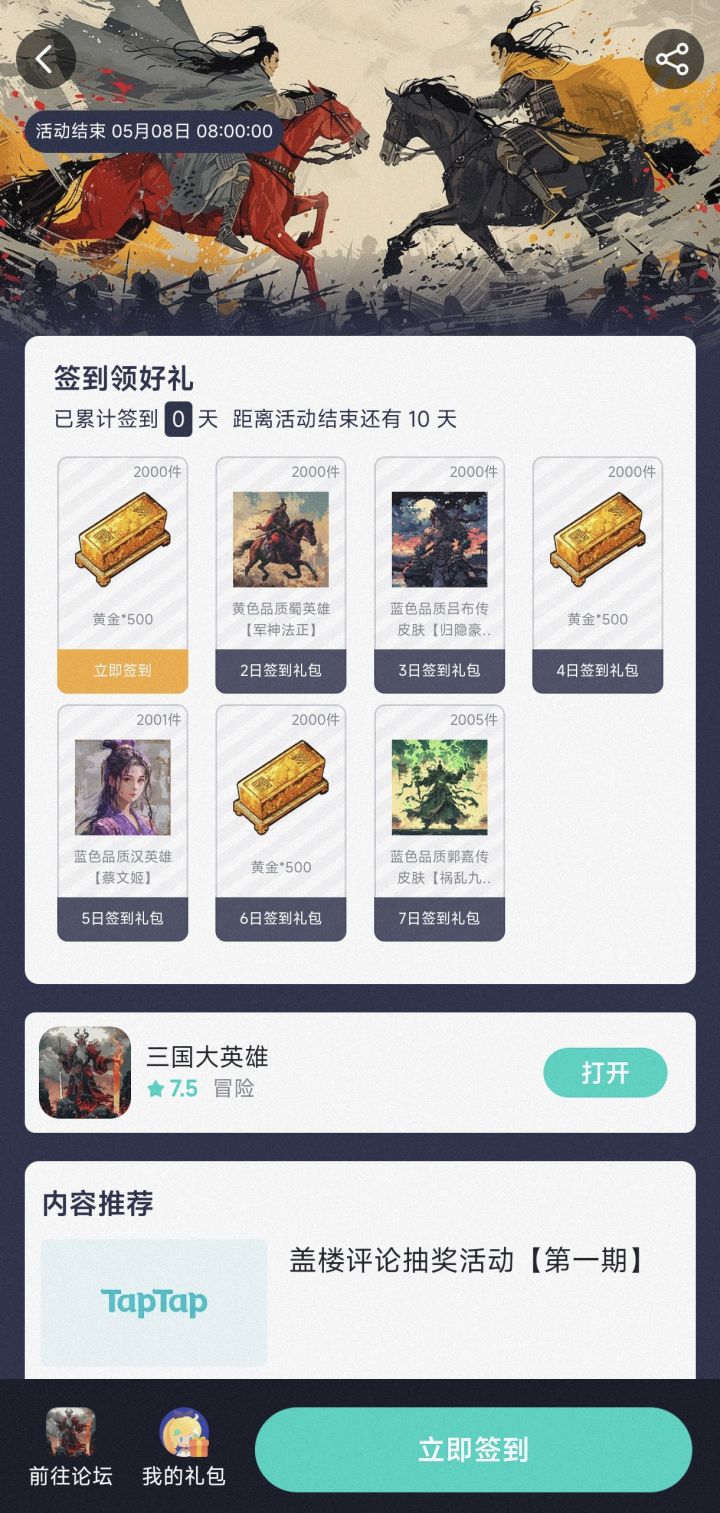1.自己的tap tap账号上,【三国大英雄】,累计游戏时长达到10小时(开启tap tap游戏时长统计)
