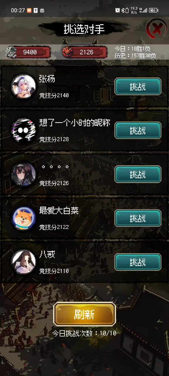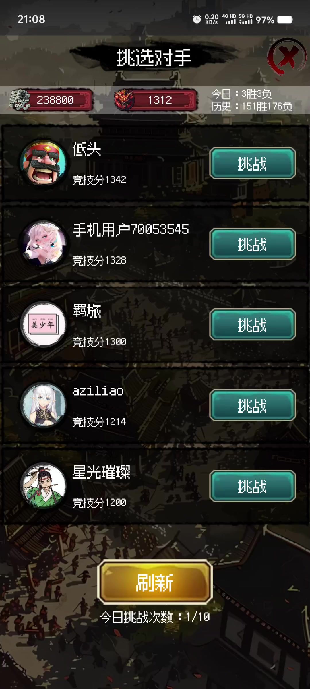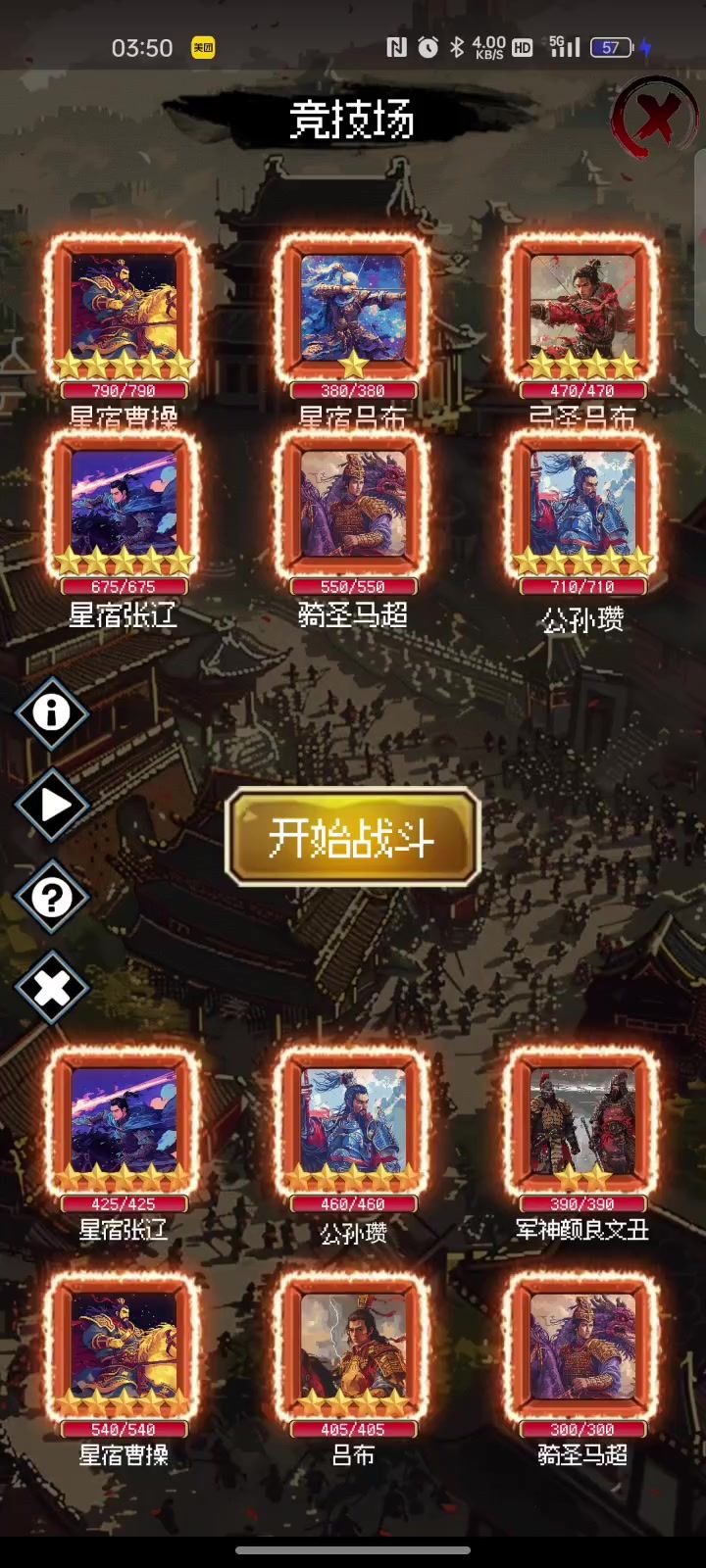 前排,尸吕布、竞技场军神、星宿姜维 后排,张角张宝张梁(顺序无所谓) 这个阵容的将都是可以通过论坛活动参与和游戏里成就奖励获得的,纯白p将。 这个阵容主打的就是全体伤害(三张的法伤与星姜技能联动,尸吕布和军神用来当坦克抗伤害) 除了碰上大氪玩家,基本不会输。 目前战绩,200场188胜12负。也就是说我有8天10场全胜,有12天10场9胜。对于0氪玩家来说,还可以了。
