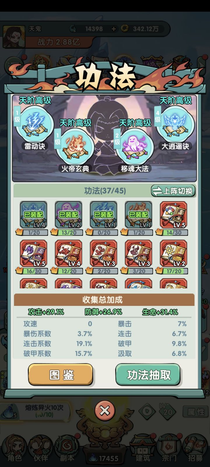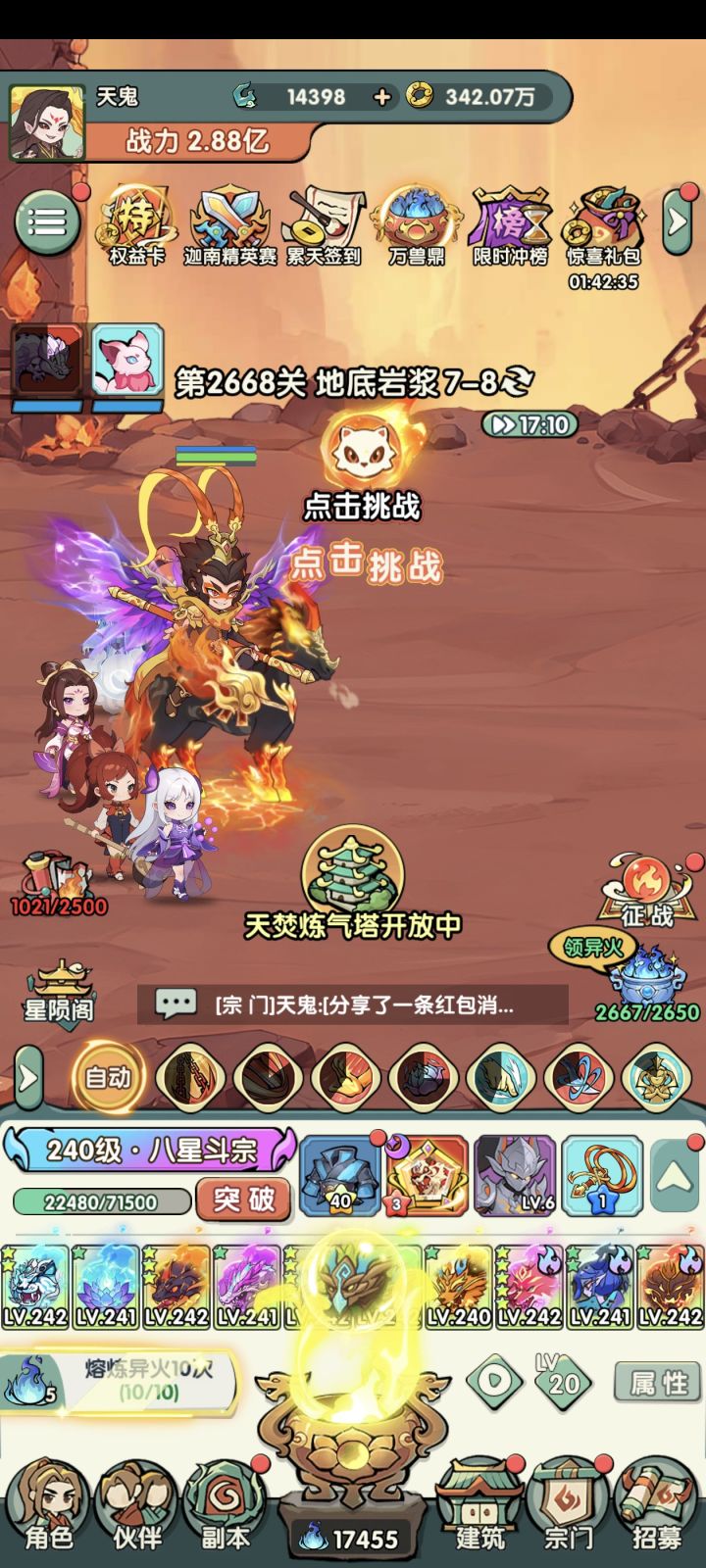 与寻道大千和斗罗那个玩法一毛一样,下方是很多的装备栏,上方自动挂机打怪,所有“基础设施”完备,竞技场爬塔什么的该有的都有。