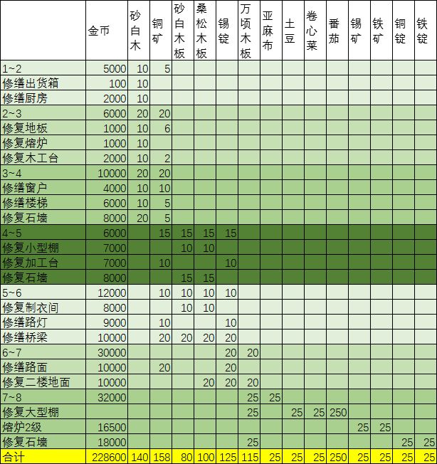 维比乌斯:膜42 玉36 爪子30 角48 提比利亚:牙42 结晶42 壳30 皮36 卢基娅:鳞片48 嘴60 爪48 头冠54 格赖娅:爪54 皮60 木冠60 腹膜48 阿皮娅:舌66 爪48 皮54 马库斯:头108 爪72 膜84 昆图斯:壳102 骨102 爪78 艾斯皮娅:棘78 牙96 翼膜102 努美利亚:玉108 黑角102 翼膜84 摩诺:苔岩90 爪9