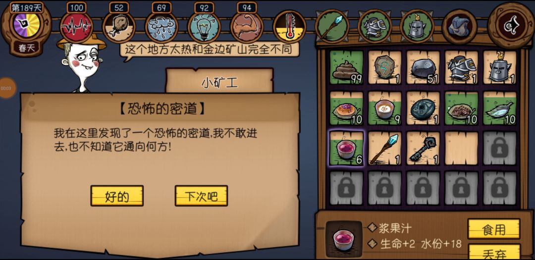 无晶石碎片状态下最好的装备打了,小偷干不过,以后去玩有晶石碎片的版本。 攻略: 开局去森林淘3次(4树枝,2石头),再采15个浆果,回家做木棒去湖找老头拿3铁斧,解锁金沙村和瀑布,然后采5草,15水回家睡觉。 去森林砍15木(用铁斧砍,石斧丢掉),回家睡觉,然后造一级科技,木箱,火堆,留点吃的喝的后面用。去金沙村找老太婆换食物(支撑挖矿用),开青山镇,去找镇的矿工换铁镐(建议至少拿到两把),开矿山。 回家睡觉,把除了稿子和食物,其他东西丢箱子里,没水的记得去河打点水,去矿山挖30石头,回家睡觉,去砍35木头。 回家睡觉,做二级科技,锅(此时最为艰难的时候,注意灵活应变,没水去淘水,没吃的去淘浆果烤着吃!!),然后睡觉,去淘够一个石锄的树枝做石锄,去金沙收12麦子,然后 记住这配方,麦子+水=面包→面包+浆果=浆果面包(饱食度重要来源),浆果+水=浆果汁(补水重要来源)。 睡觉,做2石铲,做8木板和带上防寒衣服去瀑布找冒险家开冰原和沼泽,回家准备好水和食物睡觉,然后出发去沼泽(铲用1把就够了),然后回家该补什么的就补,然后做水井,厕所,开农场,准备种子(种咖啡豆),做完以上这些大概30天,正好冬天到来,趁气温没下来去收一波麦子和浆果。 去湖凿冰做冰柜和沐浴室,做完这些36天左右咖啡豆成熟,记住这几个配方,咖啡豆+水=咖啡(补脑残)→咖啡+大便=补体力,咖啡豆+大便=补饱和度,水直接烤着用来控温,完美度过冬天。 这样搞完已经是小康水平了,剩下的慢慢搞就行。