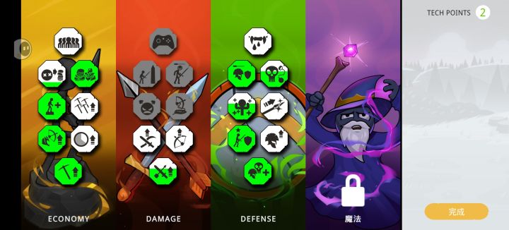 新开的档,第一关到最后一关基本一直是疯狂难度(第九关全游戏最难的关卡没加点实在打不过,换了简单打过后面再补票)。实话实说,疯狂难度跟简单难度差别太大,感觉像是两个游戏一样。所以我非非非常推荐各位试试。打完你就是火柴人战争的大佬了。我的加点供各位参考,点没加完,全加的代表很重要,黄色从下往上二排弓伤最重要,其次是绿色从下往上一二排。全部打完本来是99%的,又打了个教程第一关,加到了