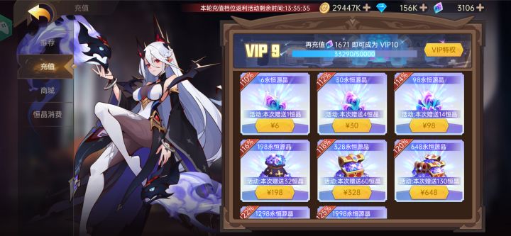 总结这段时间的体验,氪金2500左右,总体感觉还比较爽,稍微氪一点游戏体验好很多,抽卡抽的挺过瘾,副本手动操作可以进度可以肝的快一些,缺点就是两极分化比较严重,且感觉后续会需要持续氪金才能保持游戏体验吧阵容建议阵容图片里有,物理和法术3➕2比较好,建议主副c一个物理一个法术,不然抢装备很难受pve核心思路就是猩红聚怪➕一个aoe输出秒怪➕挂件给buff或者debuff➕坦主副c建议,猩红前期