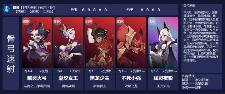 【阵容英雄】噬灵火弓,潮汐女王,黑龙少主,不死小强,赋灵夜影【阵容强度】PVE ⭐⭐⭐⭐⭐ PVP ⭐⭐⭐⭐【阵容简述】平A流,主养成骨弓,副养前排坦克,推荐小强,黑龙,白牛,如果盟约和天星差距不大,也可代替小强,奶妈可要可不要,毕竟骨弓自损血会一直吃掉奶量。女王必备,祭灵建议霜狼和丝舞,一切以提高骨弓攻速和增伤为主,双坦克亦可以更换成单坦+风暴萨满,可以吃风怒图腾的效果,另外一个后排角色可灵