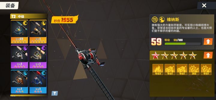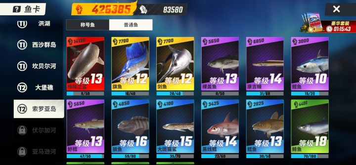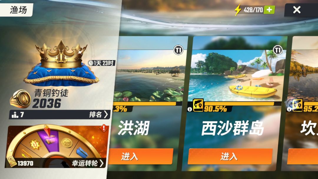 9. 推荐把维纳斯(T1淡水)和王者归来(T2咸水)这俩橙竿升得高一些,因为3个T1渔场里有2个是淡水,3个T2渔场里有2个是咸水,这俩竿适用面比较广10. 还是说回钓鱼,从第2个渔场开始,每个渔场都有6条称号鱼,对应着3档头衔,由小到大分别是奇珍鱼/超奇珍鱼/典藏神兽鱼,每档有2只。度过新手期之后,主要目标就是钓上来更多更大的称号鱼了。在解锁新渔场时会同步开2个新活动,除了一些大家都能完成的任务之外,拉开差距的就是靠钓上来的称号鱼的数量和分数了11. 至于怎样钓上来更大的鱼,就需要玩家持续提升鱼卡等级了。卡包的产出途径挺多的,主要是锦标赛和各类活动当然还有礼包,开卡包升级鱼卡等级能够显著提升鱼的重量,从而提高鱼的评级(B/A/S/SS)和评分,每一级提升10%的重量,第一周一般能升到十几级,相比于初始状态就已经是2倍多的重量了。钓鱼时不断的创造新记录也是源自于鱼卡等级的提升12. 在渔场内除了能钓上来鱼,还有有两类特殊事件,分别是半截鱼-神秘巨物,以及藏宝图。神秘巨物是个buff,接下来半小时钓到这条鱼的几率提升100%,体感一般在10竿内(10体力一竿)就能钓上来图标上显示的那条鱼,也有可能钓上来的不是图标上的鱼,但buff还会继续存在。这个神秘巨物的buff是玩家比较期待的13. 而藏宝图,效果是一竿消耗的体力乘以N,钓上来的鱼评分也乘以N,N在一般为2、3、5、10、20、30等,只能说有一些作用但不大。在藏宝图状态下,可以一竿200多万分,很爽,一下子把锦标赛的奖励顶满(50万分就满了)并把第2名吓尿,还有左上角的“钓鱼得积分”活动也能拿好多奖励,但是这游戏很多活动是需要你钓上来3条或5条所在渔场的称号鱼的,你一竿的积分乘30,但钓上来的数量并不会乘30。而且有时候系统会搞事情,一竿300体力消耗掉了3000体力,一条称号鱼都没有,然后拍你脸上一个体力礼包,你懂的14. 关于绿钞的获得和消耗,绿钞是这游戏里的付费货币,相当于其他游戏里的钻石,1RMB=20绿钞(首充双倍),且没有区分付费钻石和免费钻石。每次锦标赛冲到50万分能给200绿钞,但在没有活动产出大量体力的情况下一般是冲不到50万分的。怎么用绿钞就看各人习惯了,3000/3500绿钞一个T1/T2橙杆,有时会出现7折;1500绿钞一个橙箱子,时常出现4折,个人买过几次;买体力分别是30/30/60/60/100买30点体力,个人习惯买4次体力,再消耗20绿钞刷新一次钓箱,正好完成那个“消耗200绿钞,奖励100绿钞+100体力”的任务,相当于用100绿钞换220点体力暂时想到这些,也欢迎各位帮忙补充
