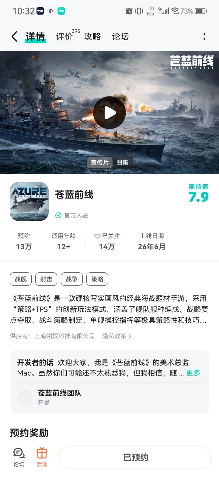 超期待《苍蓝前线》!TPS操作搭配策略卡牌的双玩法太亮眼,亲手操舰对轰超带感,编队博弈又满是烧脑乐趣。名舰建模细节拉满,海面光影氛围感十足,希望能多上新国产战舰,优化对战手感,让硬核海战体验更丝滑,早日正式上线驰骋苍蓝海域!