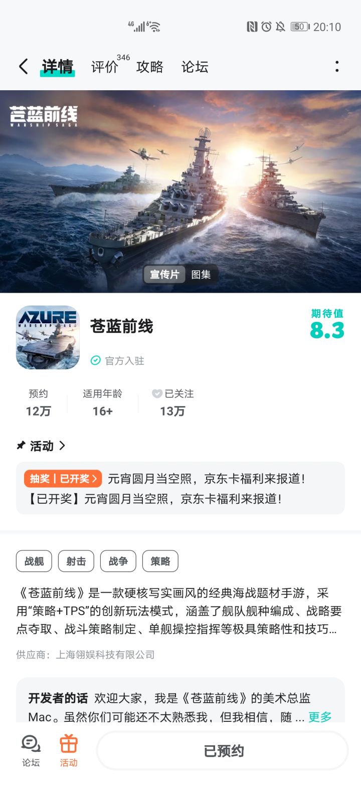 各位舰长,请就位!战备集结的号角已经吹响,《苍蓝前线》的征途需要留下您的足迹!无论您是刚刚抵达港口的新舰长,还是已经历过数次海战的老舰长,现在,只要在本平台的游戏《苍蓝前线》社区内单独发布帖子,并截图您所发布的帖子,将截图回复至本活动帖的评论区,即可参与抽奖!我们将在留言的舰长中随机抽取1位送出【50元京东卡】*1! 【活动内容】只需在本平台的游戏《苍蓝前线》社区内单独发布帖子,并截图