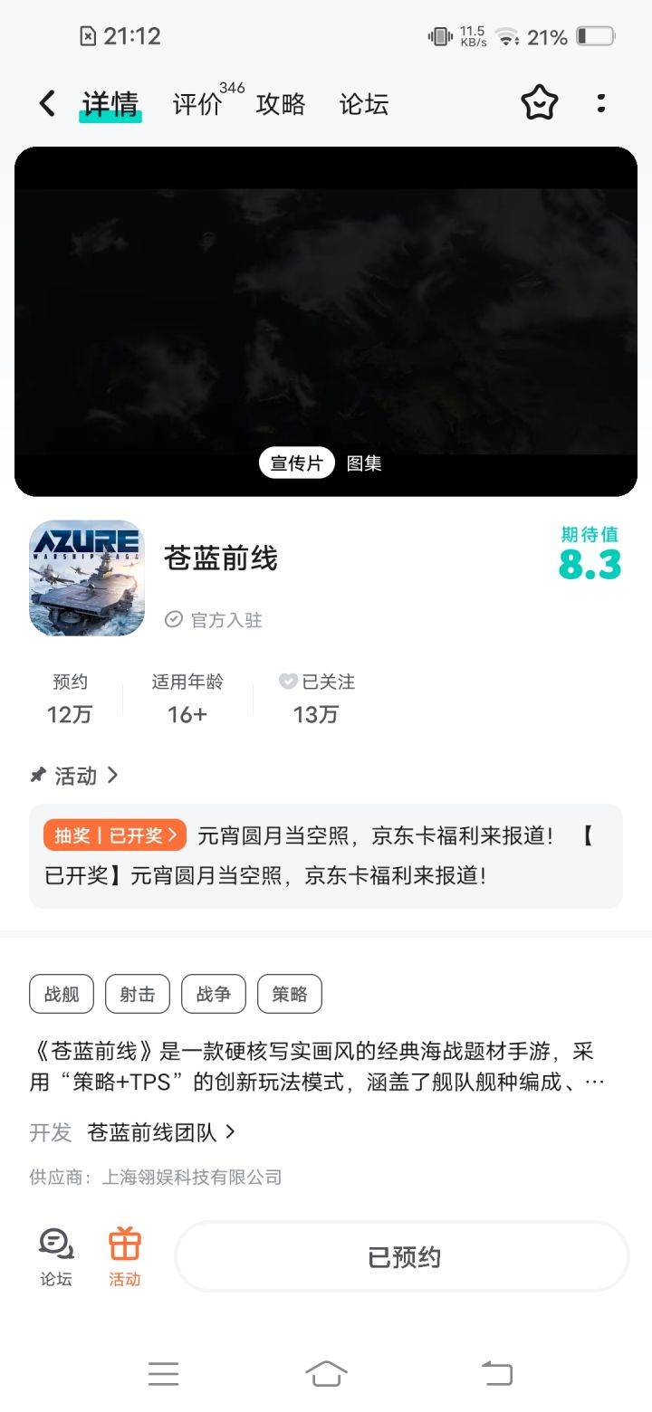 各位舰长,请就位!战备集结的号角已经吹响,《苍蓝前线》的征途需要留下您的足迹!无论您是刚刚抵达港口的新舰长,还是已经历过数次海战的老舰长,现在,只要在本平台的游戏《苍蓝前线》社区内单独发布帖子,并截图您所发布的帖子,将截图回复至本活动帖的评论区,即可参与抽奖!我们将在留言的舰长中随机抽取1位送出【50元京东卡】*1! 【活动内容】只需在本平台的游戏《苍蓝前线》社区内单独发布帖子,并截图