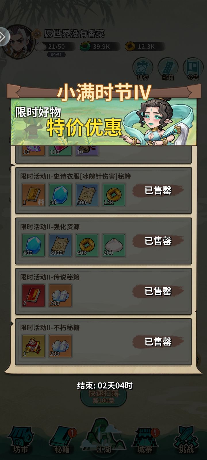 不要被0.1折骗了,就这个五一活动来说,最便宜礼包600金票,就是6块钱,10抽,200抽保底1个兑换道具,还要10个才能换一本红色秘籍。不是氪金大佬就不要玩了。只充月卡不氪金,纯纯就是坐牢,一个月内关卡最多推到十几二十关,每天除了扫荡没啥可做~游戏内充值也就只有3毛钱月卡最实惠,其他都是贵到天际那种🙄🙄🙅🙅🙅这还是充值问题,再说说打关卡发牌的技能选择,假如自带3个技能,他还会给你出新的技能让
