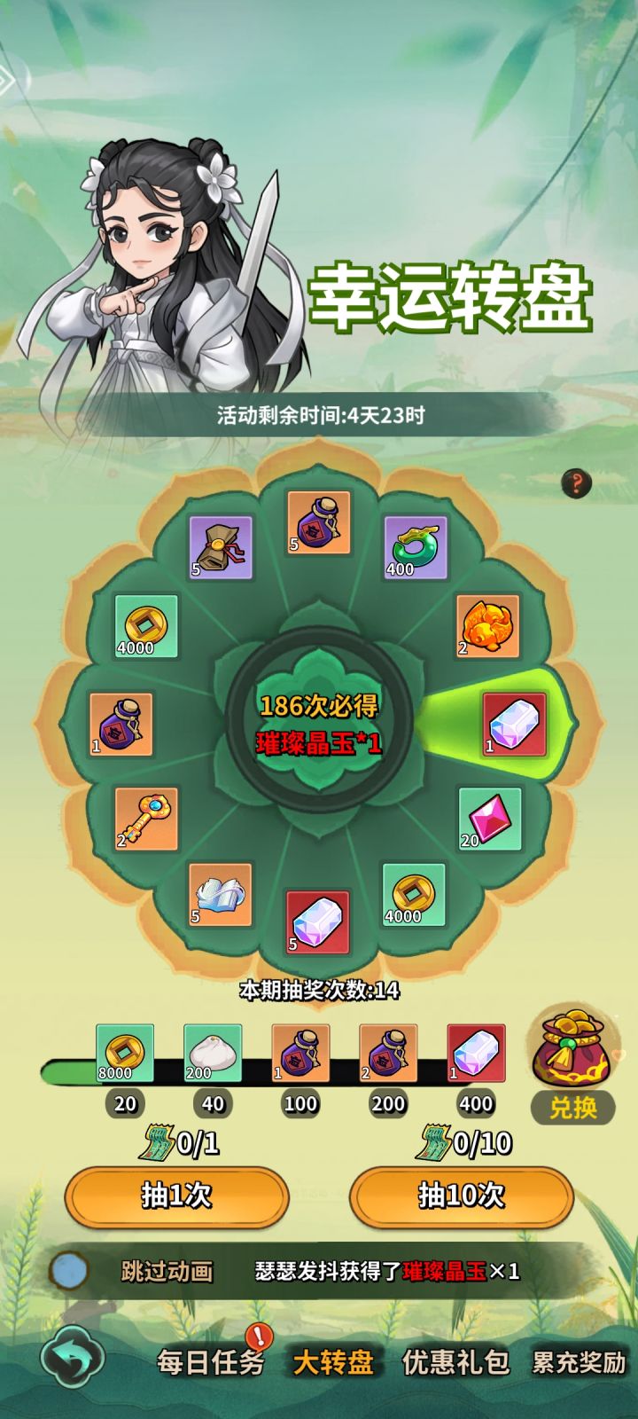 不要被0.1折骗了,就这个五一活动来说,最便宜礼包600金票,就是6块钱,10抽,200抽保底1个兑换道具,还要10个才能换一本红色秘籍。不是氪金大佬就不要玩了。只充月卡不氪金,纯纯就是坐牢,一个月内关卡最多推到十几二十关,每天除了扫荡没啥可做~游戏内充值也就只有3毛钱月卡最实惠,其他都是贵到天际那种🙄🙄🙅🙅🙅这还是充值问题,再说说打关卡发牌的技能选择,假如自带3个技能,他还会给你出新的技能让