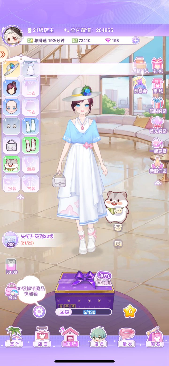 日积月累,服装店名声越来越大,便新增了不少顾客(收集养成)+量衣改造业务(数值比拼闯关)同时也出去交际应酬,装扮走秀必不可少(数值比拼闯关)