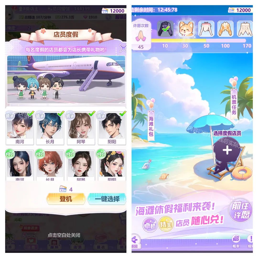 #开间服装店 例如新衣,雪公主,囤囤鼠,吹气球这些跨服活动都是根据你员工的分数来算,囤囤鼠是根据十个后勤员工的数量来算,吹气球是甜妹的等级加成。 海滩度假,开箱子,冲业绩等就是个人活动,达到一定标准就领奖励,可以在没有活动的时候攒一攒。 闪耀,赚钱和团队,就是在规定时间内加了多少相应的闪耀和钱,按照这个排名最后领奖励。也可以提前攒一攒。赚钱就可以提前九个小时下线,多领一点离线奖励等等这些“卡bug
