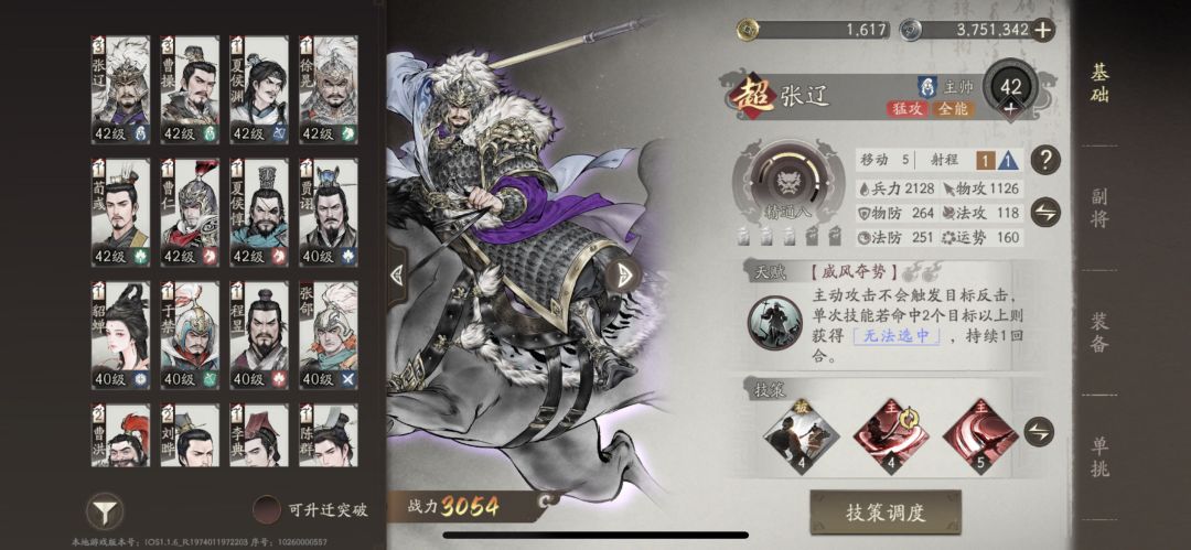#三国望神州 #三国望神州攻略 #游戏攻略 UID:10260000198 剧本等级:42 曹仁,人称天人将军,以后不好说,但是目前就是全游最强单体输出,暂时没有up池,可以从新手池或者up池中歪出 目前我曹仁42级(3迁状态),攻击面板高达1249,进图算上各种buff轻松过1700 天赋介绍 释放任意技能或战法后可以给自己及友军提供奋战buff,奋战这个buff非常强力,提供高达75%无视防