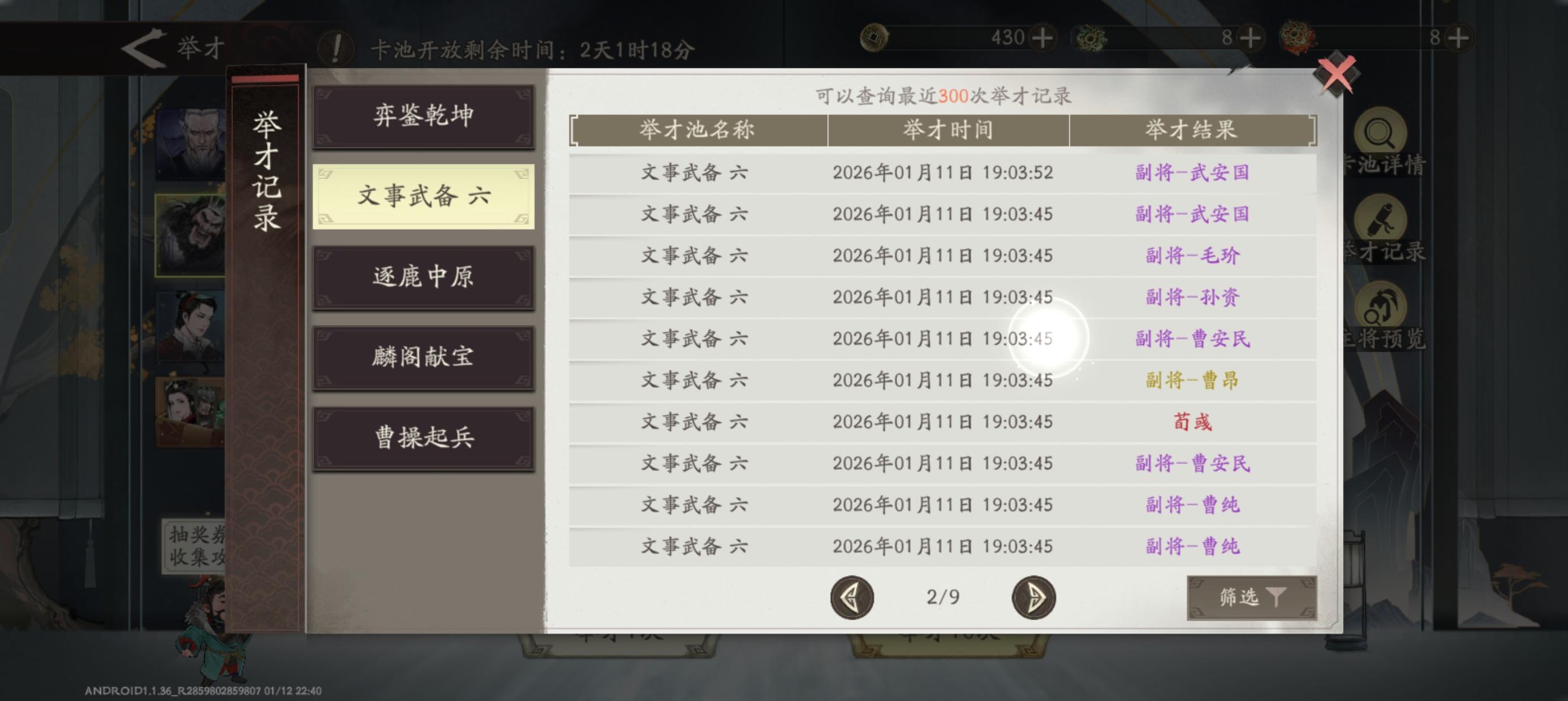 贾诩蔡琰全跳过。即使这样也出现问题 下个上半英雄且不说能不能抽到,肯定是抽不到两百的,商店也换不起。就是会出现即时拿到英雄也没配套副将的窘境。 微小氪尽量攒金珠吧。斩将的副将可能是最容易的新副将获取方式了。 别琢磨新寻访,就算是有这个事,也不知道要什么时候实装,且不会同步到最新副将。 当然还有一种解决方式。 我tm在梦天钢作威作福横行乡里,我受你这气。 (巅峰迎来虚伪的拥护,黄昏见证真正的信徒。我