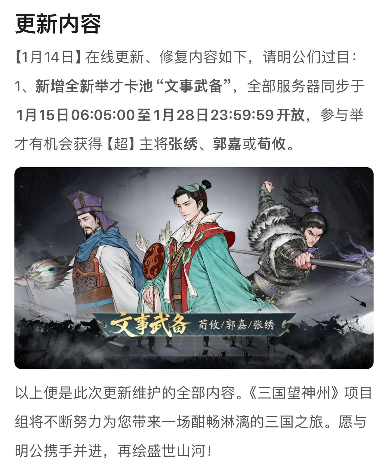 亲爱的明公: 为持续优化游戏品质,带来更稳定优质的征途体验,我们已对游戏内部分问题进行了修复与调整。请明公们注意重启游戏客户端并根据提示完成资源下载,即可体验更新内容。当前游戏内各问题进度如下:更新内容【1月14日】在线更新、修复内容如下,请明公们过目:1、新增全新举才卡池“文事武备”,全部服务器同步于1月15日06:05:00至1月28日23:59:59开放,参与举才有机会获得【超】主将