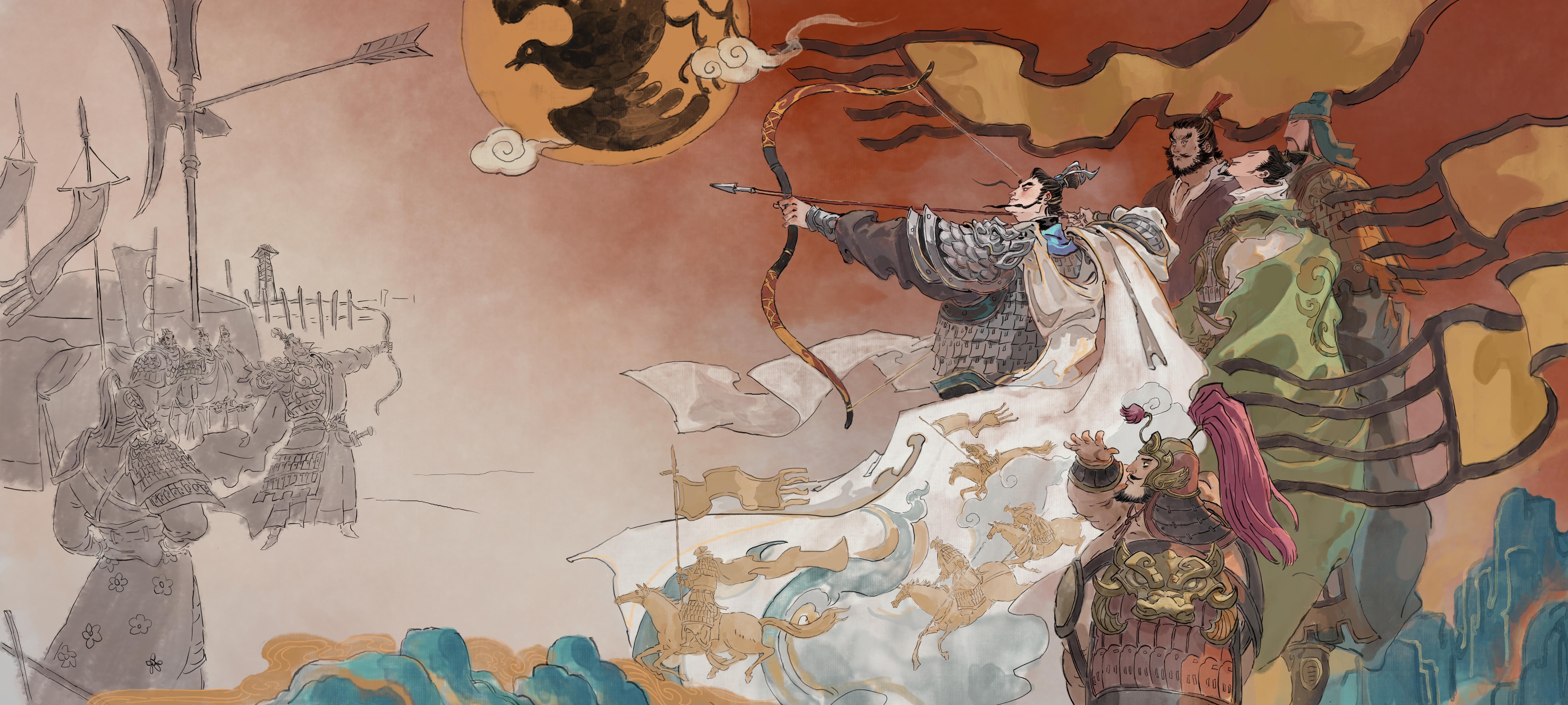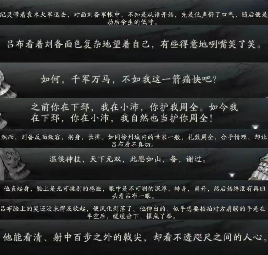 辕门射戟,堪称吕布个人英雄主义的巅峰,却也是其生涯下坠的明确起点。在三望更新的吕布卡池活动的连环画也复现了这一名场面。 纪灵领大军来讨刘备,刘备求援,吕布以箭中戟小枝为赌注,中则退兵,不中则开战。画面中,吕布挽弓搭箭,箭指向百步之外辕门上的方天画戟。比起单纯的箭术炫耀,这更像以其武力担保的政治表演——无论射中与否,“如提童稚”的纪灵都难对结果有异议。“布性不喜合斗,但喜解斗耳”,更像是以武夺盖