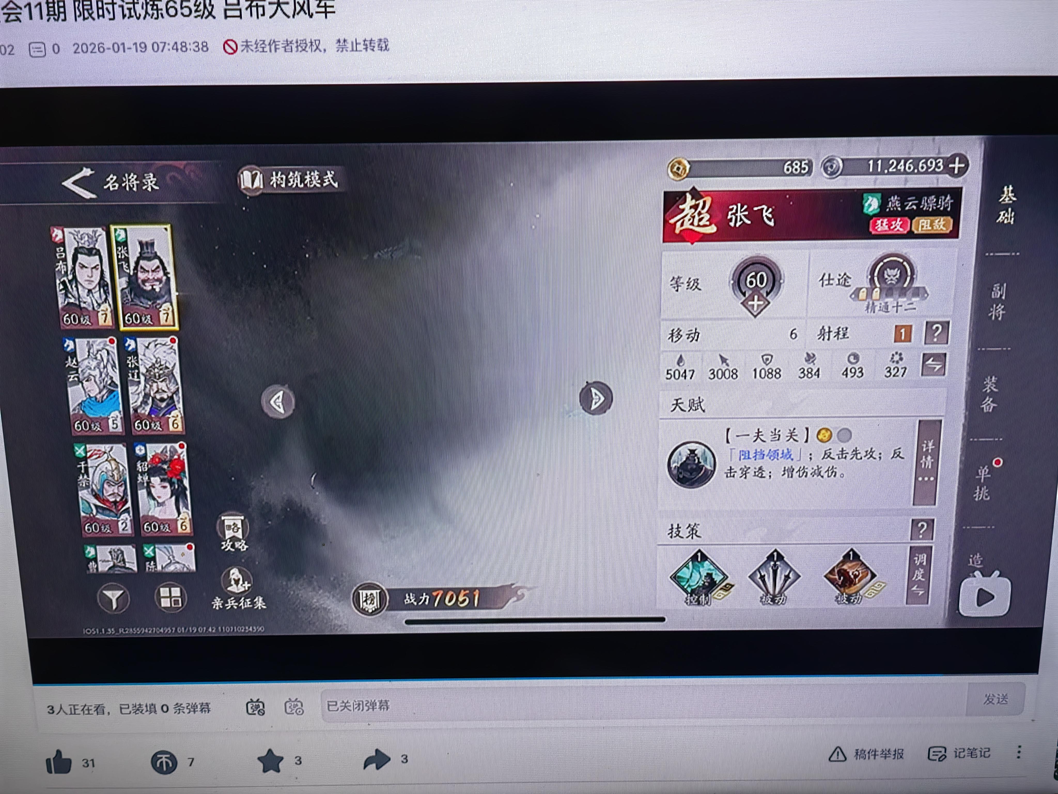 本周周本通关65上阵武将:张飞,于禁,许褚,程昱,陈登,李典思路:第一回合陈登,程昱轮流放群体技能,许褚跳一跳把刘备击退一格,李典放技能被动给张飞加速,张飞吼四个,于禁不要前冲,卡住吕布群体技能的距离。第二回合,陈登控制典韦,然后杀人什么的会减技能cd,无脑吼就行了,注意于禁的警戒范围,祝大家通关。