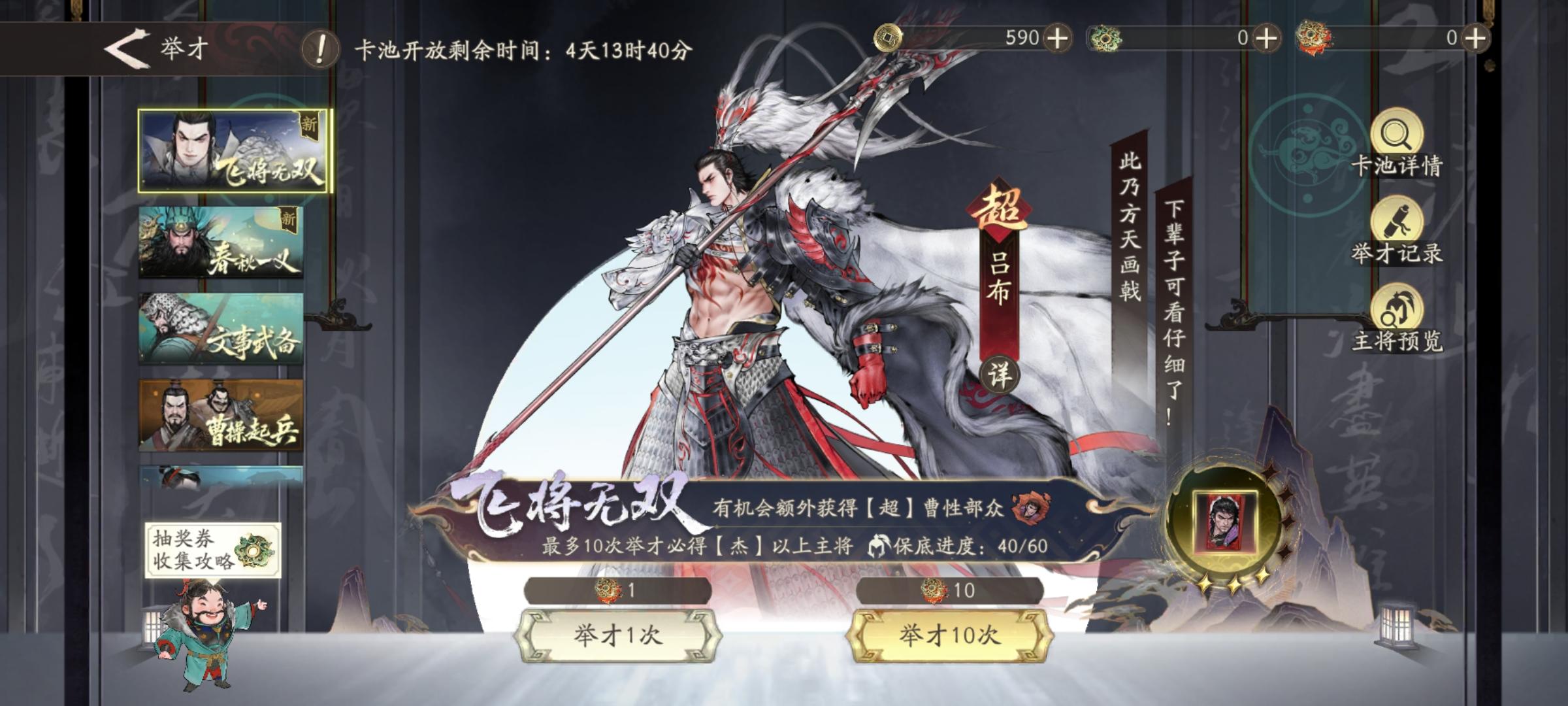 作为平民玩家,主线都过了,每天就是上线收菜,目前的难点在于周本,可以说全靠枪兵张飞挑大梁,过关搭配一般是于禁+张飞+X,再配个辅助+郭嘉+阵势需要人员,由于人员开局会被分割,就特别需要一个有特殊机制的或者能抗的住角色来改变战局,那吕布有什么呢?先说职责:统帅和骑兵,统帅没有自身阵法,上阵连凑羁绊的功能都没有,如果必须要需要统帅曹操不香吗?那就是说吕布其实只有骑兵一