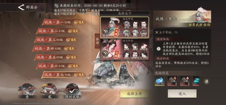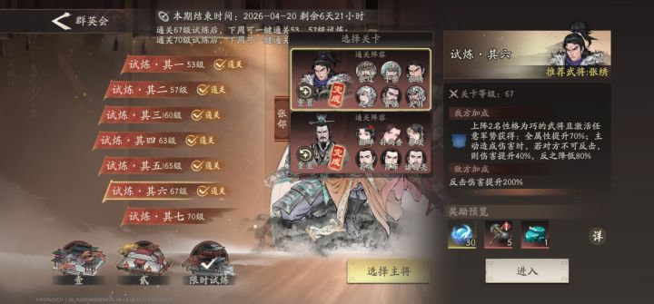 最后两关都是,全靠郭嘉一下一个人头拉扯过的。。。在这个3.0英雄遍地走的版本,也就只有郭嘉这个原始人还能上场了😁,这周的群英让郭嘉玩家有了点策略的感觉。。。。67的克制完全是瞎扯,一个巧把刘关张克完了👿。
