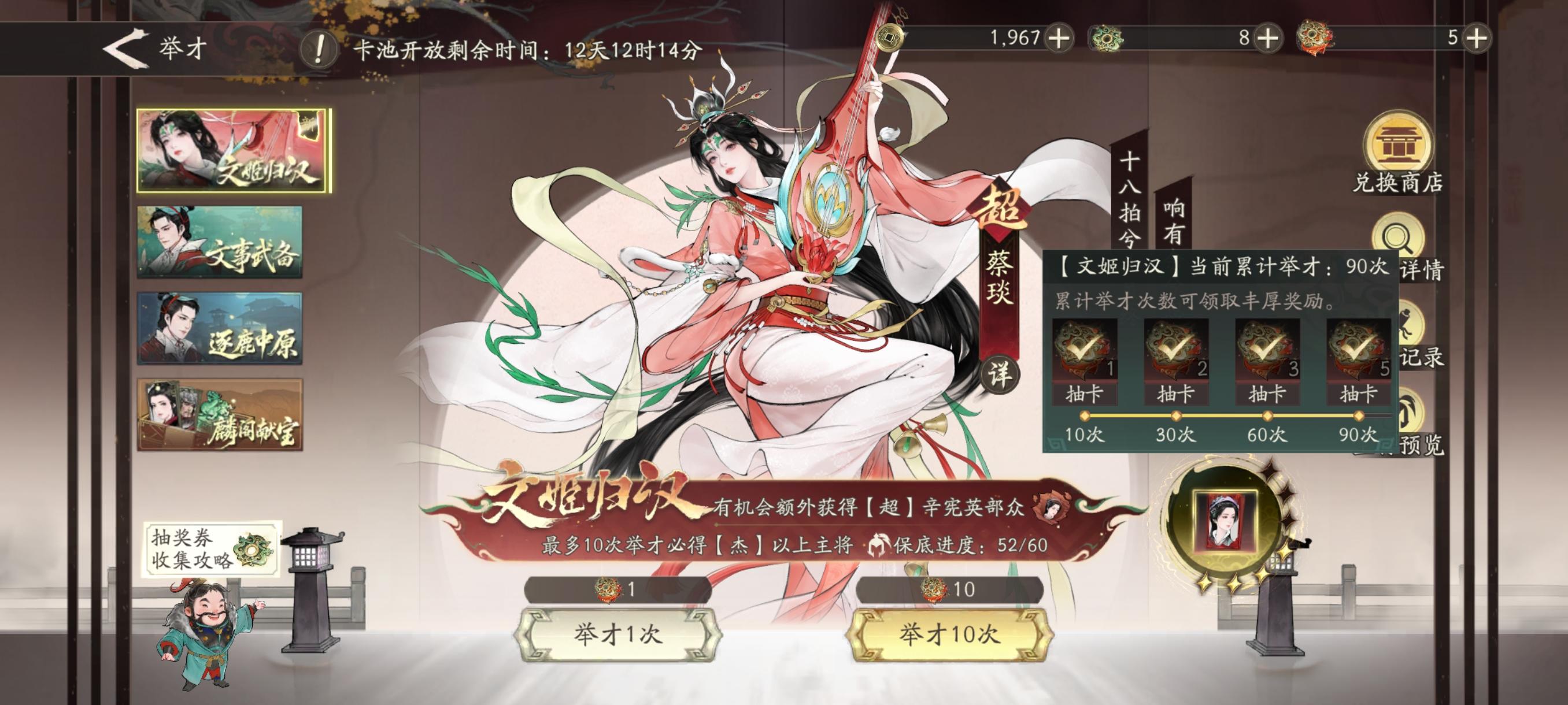 春节十抽就能出up了看来九区全勤签到第一个up池关羽歪了四十多抽出的貂蝉,合计九十开了大小月卡,然后张飞没歪(唯一没歪的up,也五十多抽然后赵云,用的很少,歪了荀彧,抽到了九十,牵招跳了吕布先歪了一只荀彧,歪后五十多抽出的第一只吕布,差一点一百二提前出了第二只吕布高顺歪了张辽贾诩跳了,蔡琰九十抽歪了荀攸没出普池少曹仁郭嘉张绣没有,up少牵招贾诩蔡琰出货基本抽数区间是50-55,单纯