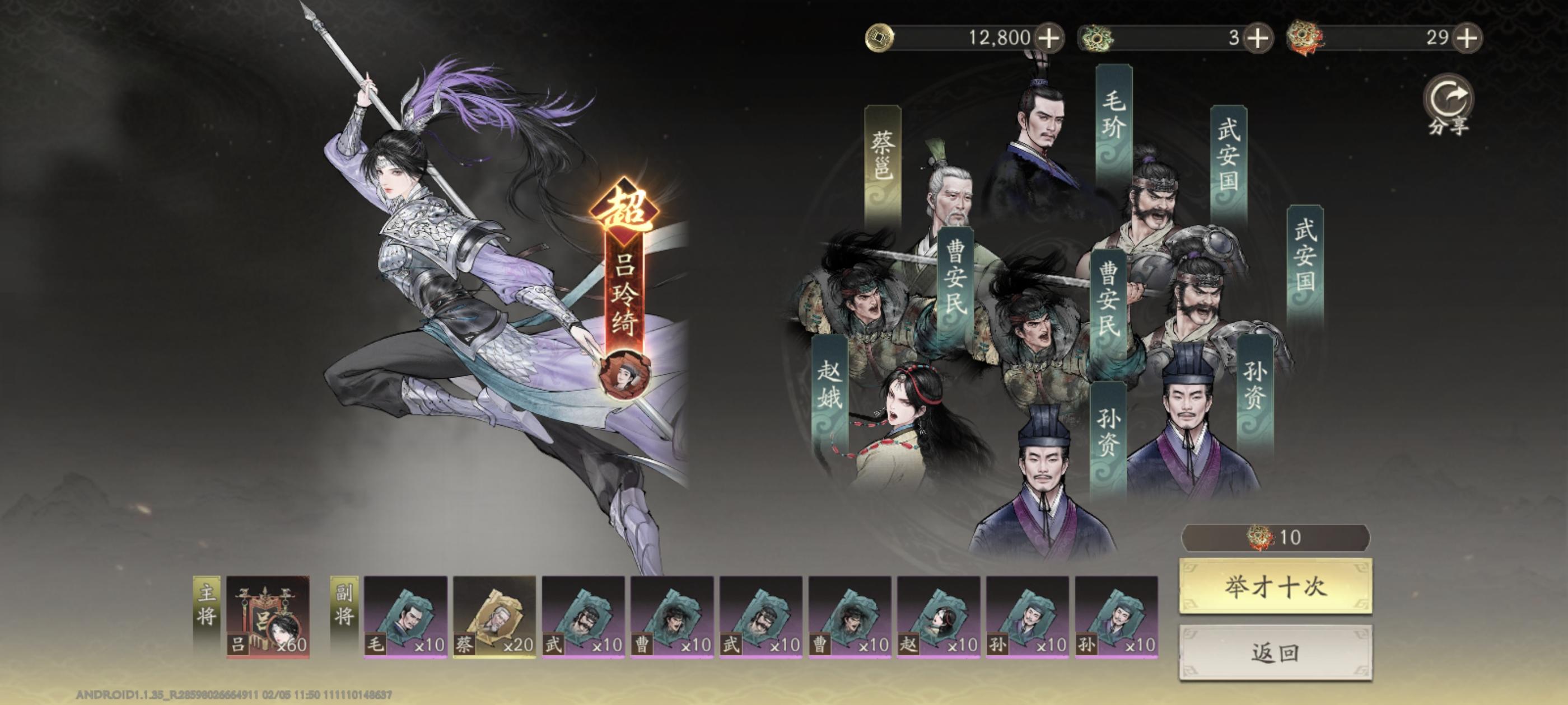 大号从开服玩到现在,目前就是乱杀长草了,买了一个六抽出蔡琰的初始号,试试有之前的经验零氪能玩到什么程度,也算是给新玩家一个参考,不定时更新号是2月2号整的,更新一下进度:等级达到26级,抽了曹操起兵池子,好消息是①20抽成功出了程昱,立省20抽②第一个文事武备池子51抽出张辽,51抽出于禁,停手。限定池子一个都还没碰,等诸葛ing2月4号,今天等级33