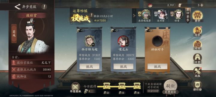 可惜我有专虐土豪的郭嘉,贾诩,我一个哗变,你的吕布就是我的。还有郭嘉手长机动强。。。郭嘉贾诩就是平民的竞技场战神。。。要打竞技场积分解锁段位官的乘现在设施战赶紧啊,土豪都把自己围起来,骑兵腿断了,手动一个个解决很容易,十星诸葛吕布张辽的阵容也被我零氪锤爆了。要是其他模式对面一群骑兵冲过来根本打不过