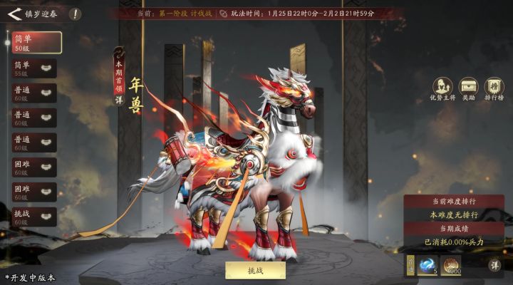“传说有妖叫年兽,岁夕呼啸入千户……”诸位明公大家好!腊尽春回,岁律将新。当人间烟火缭绕、爆竹声震天之际,那只深藏于传说中的年兽,亦将踏着旧岁的余烬嘶啸而至。新春限时挑战玩法【镇岁迎春】将于本周四版本更新后开启!诚邀诸位明公提剑镇守,共驱年兽,守护神州安宁。【镇岁迎春】玩法介绍第一阶段:讨伐战该阶段为挑战boss玩法,明公可最多上阵3支队伍轮番挑战本期首领【年兽】,每轮挑战结束后的首领